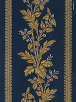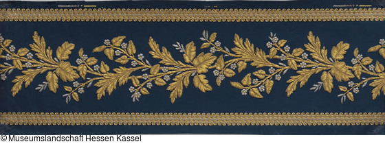 Papierbordüre mit Imitation einer Nadelmalerei und applizierter Gold- und Silberborte auf blauem Grund |