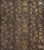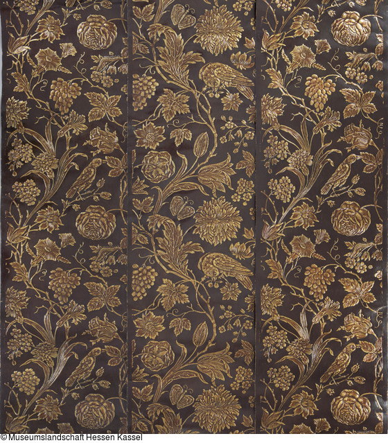 L DTM T 908 b: Tapete, Lederimitat, Wein- und Blumenranken in Gold auf Schwarz