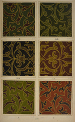 L DTM T 445 a: Papiertapete mit Imitation einer Applikationsstickerei zweier unterschiedlicher Samtgewebe, Musterblatt mit sechs Farbstellungen